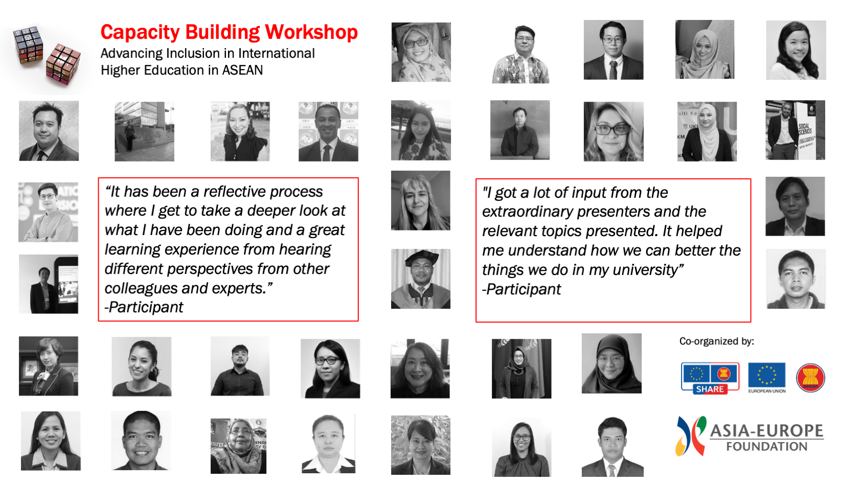 The ASEF Capacity Building Workshop was done in cooperation with the EU-SHARE Programme to promote the advancement of inclusion in the international activities of ASEAN universities. The 5-week online learning journey brought together 34 higher education managers, academics and researchers interested in advancing inclusion in international activities of their respective universities. The Capacity Building Workshop took place from 15 November 2021 – 17 December 2021. Its concept was inspired by the outcomes of the 8th ASEF Regional Conference on Higher Education (ARC8).